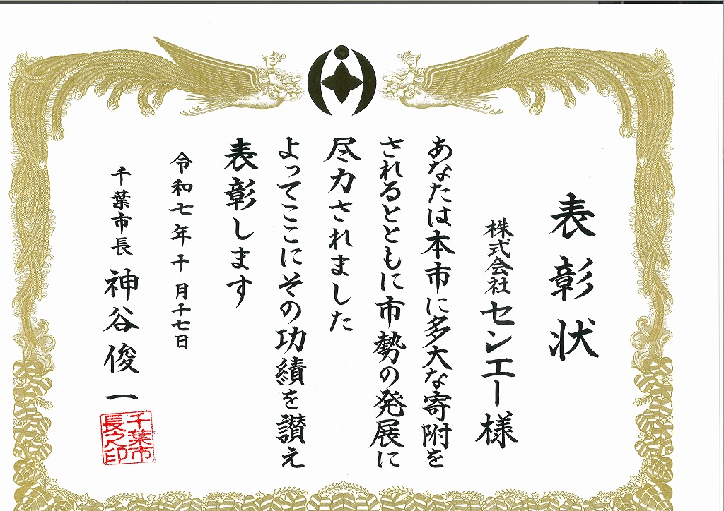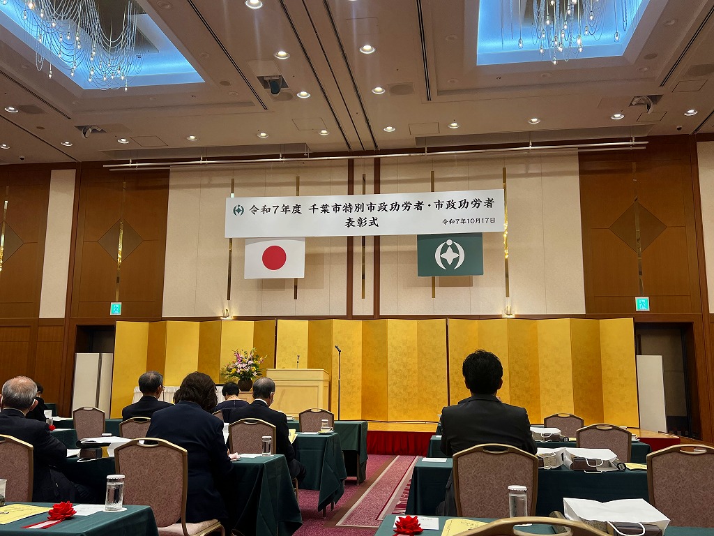 令和7年度千葉市特別市政功労者・市政功労者表彰式が開催され、今年も市政功労者表彰を受けました。 これは、わが社のCSR活動の一環で社員からの募金を毎年 市へ寄付していることへの表彰です。 お世話になっている地元行政へ、寄付金で還元しております。 今年度は教育委員会を通じておこなった、部活動の熱中症対策グッズに対しても表彰いただきました。