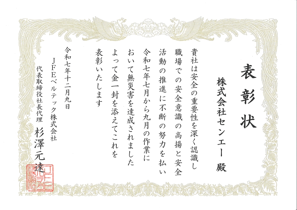 JFEベルテック様より労働災害防止協議会の中で、7月から9月までの無災害表彰を