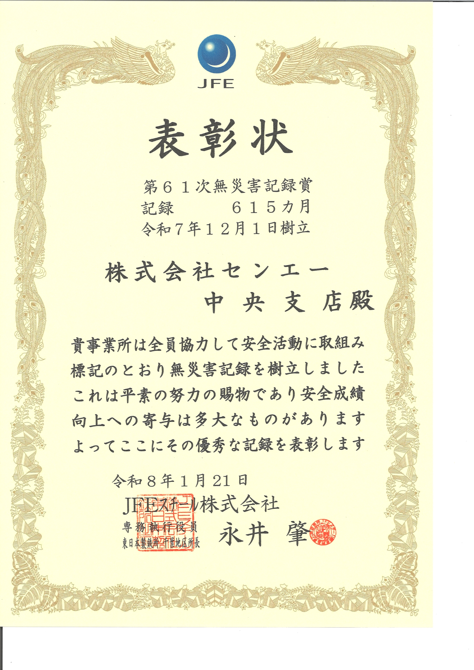JFE-S様より第61次無災害記録賞を頂きました。615ヶ月、51年間長きにわたり休業